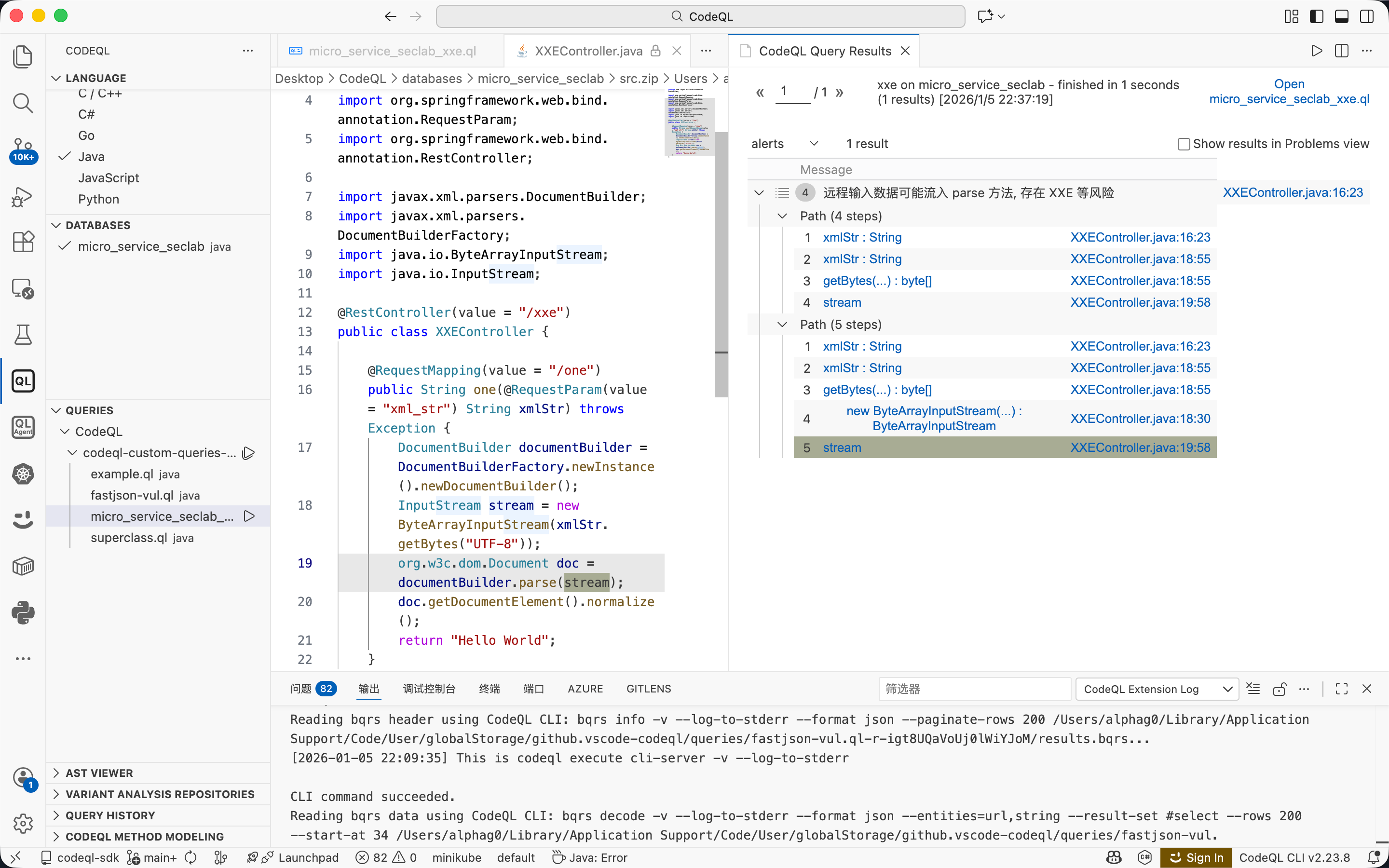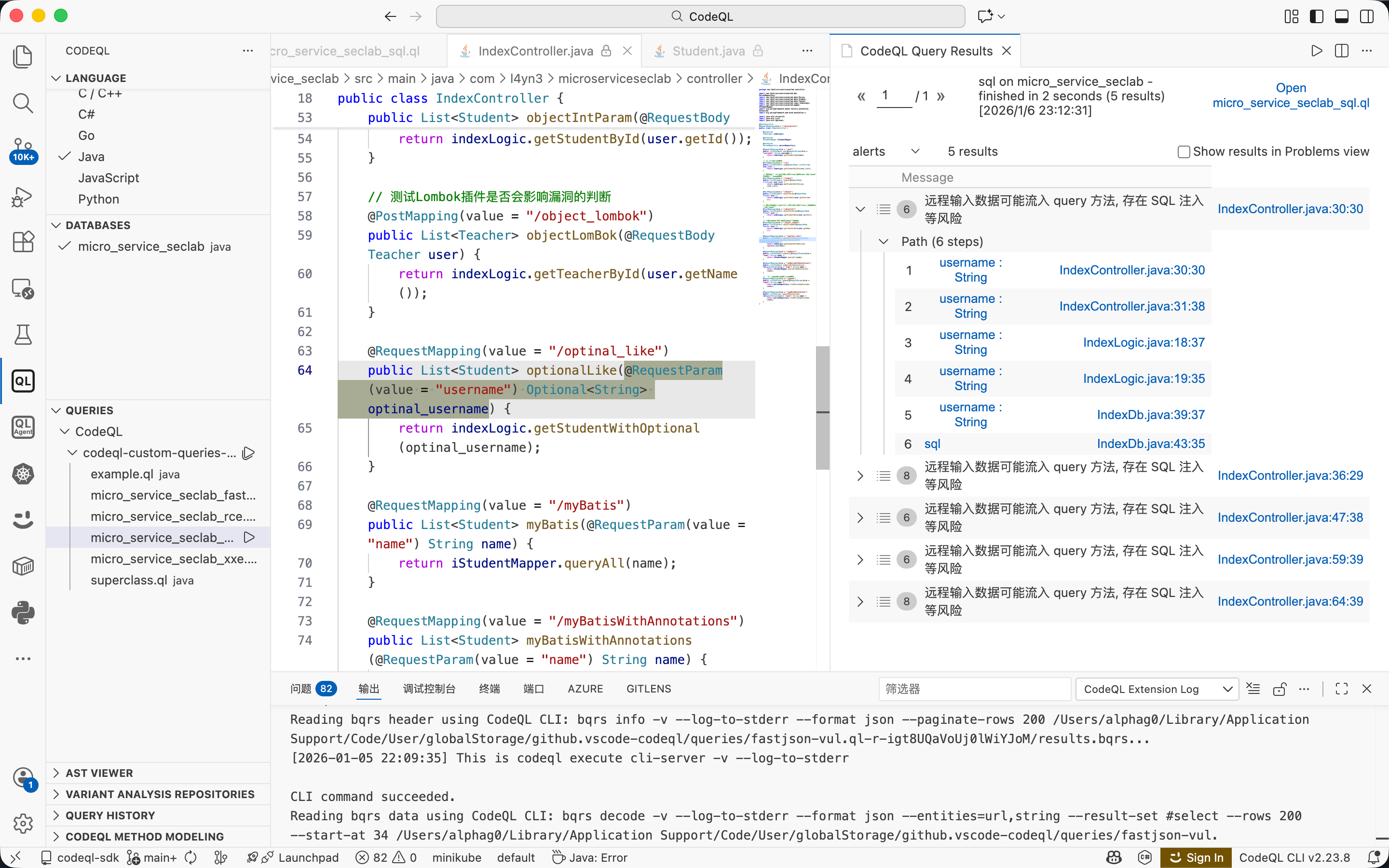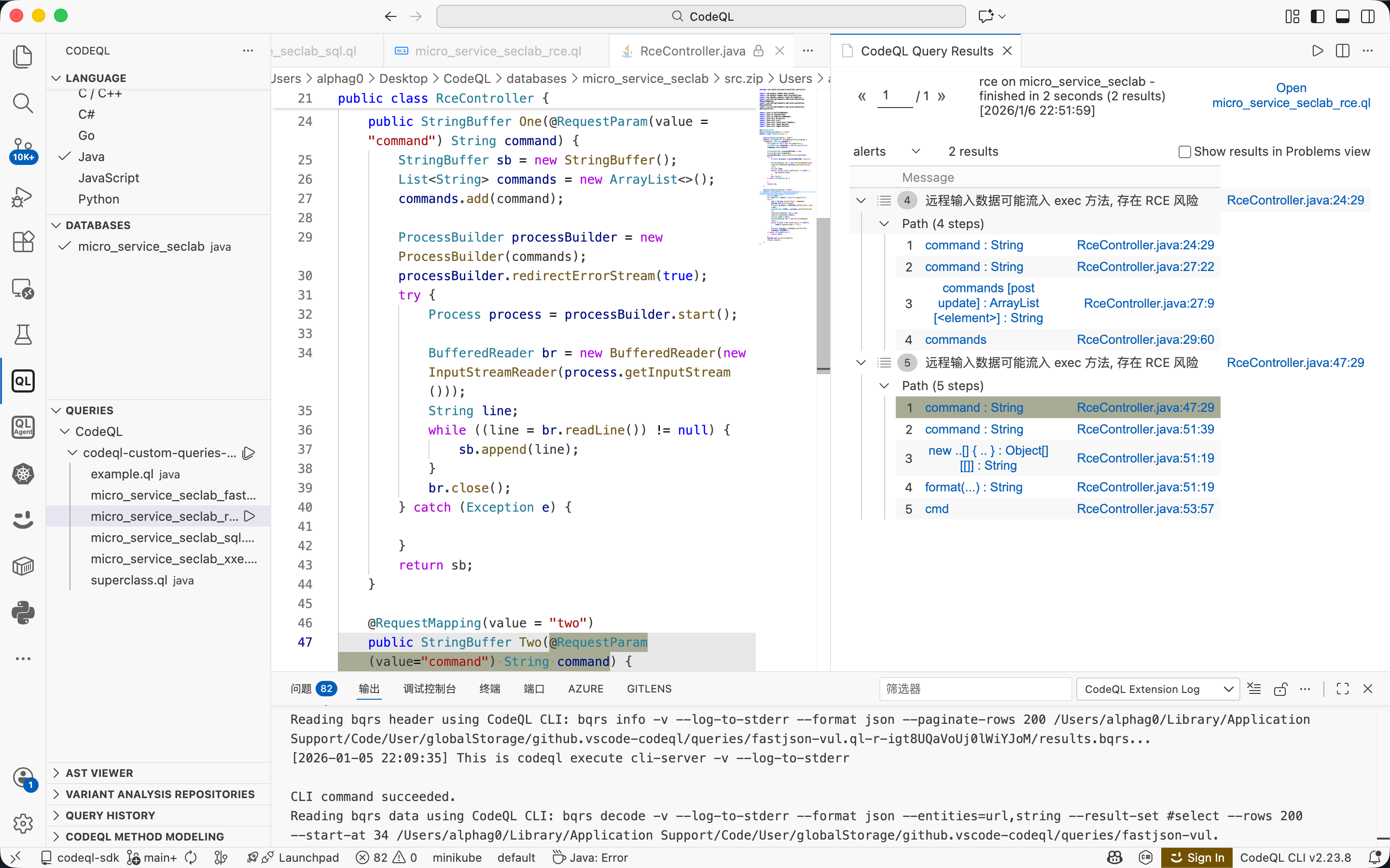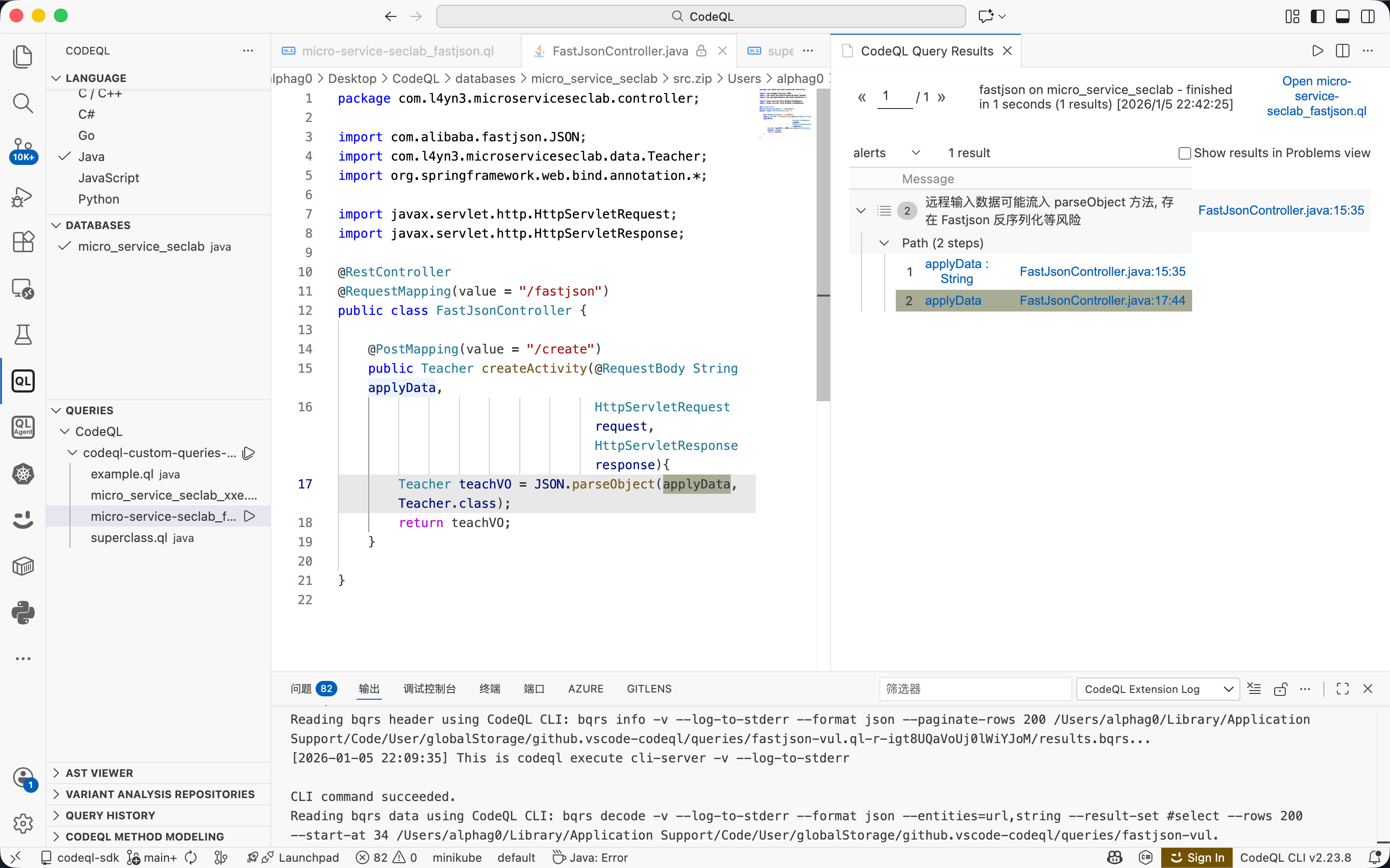 1 2 3 4 5 codeql database create <数据库名> --language=<语言标识符> --source-root=<源码路径> codeql database create ./databases/micro_service_seclab --language="java" --command ="mvn clean compile -DskipTests" --source-root=./micro_service_seclab/ --overwrite