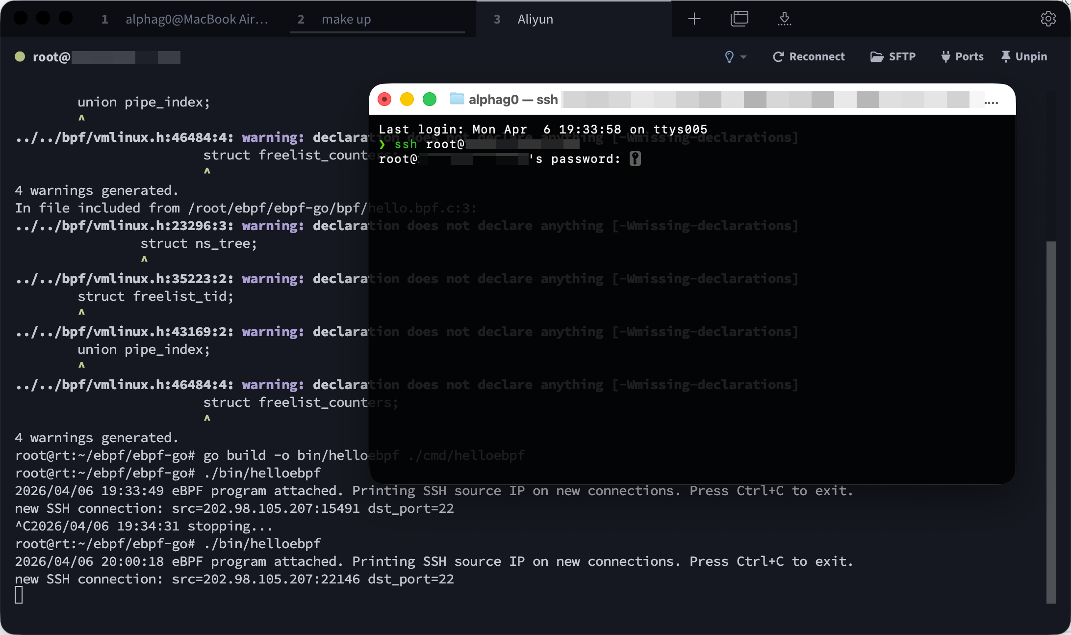 测试代码 先编写一个eBPF程序,并使用bpf2go进行编译,该程序运行在内核态。它挂到sock/inet_sock_set_state tracepoint,筛选IPv4、TCP、状态变为已建立、且本地端口是22的连接,然后把客户端IP、客户端端口和服务端端口写进ring buffer,上报给用户态。