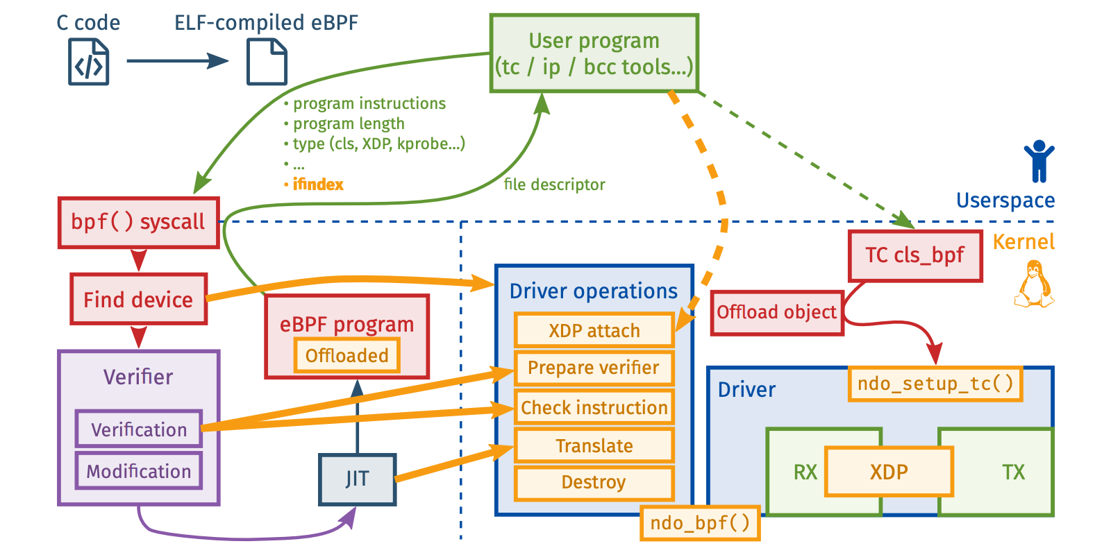 下图展示了Offloaded XDP运行模式下,eBPF程序从从用户空间编译加载,到内核验证处理,最终挂载至网卡驱动的全生命周期流程。
