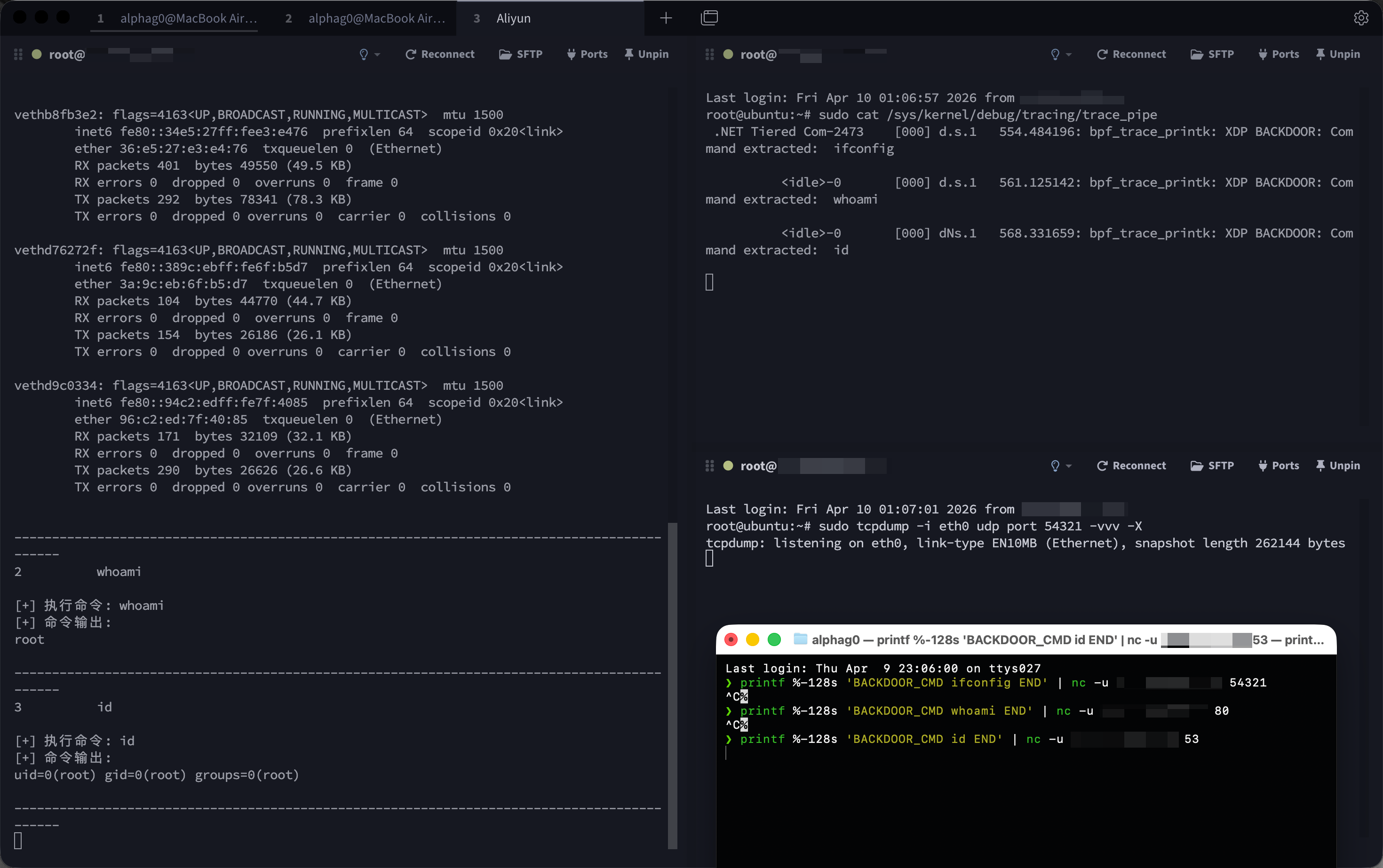 可以看到任意端口都可以被激活,无需开放特定端口,成功执行命令。并且由于发送的Payload通过了多重信标验证,会触发XDP_DROP,导致tcpdump无法捕获到对应的请求。