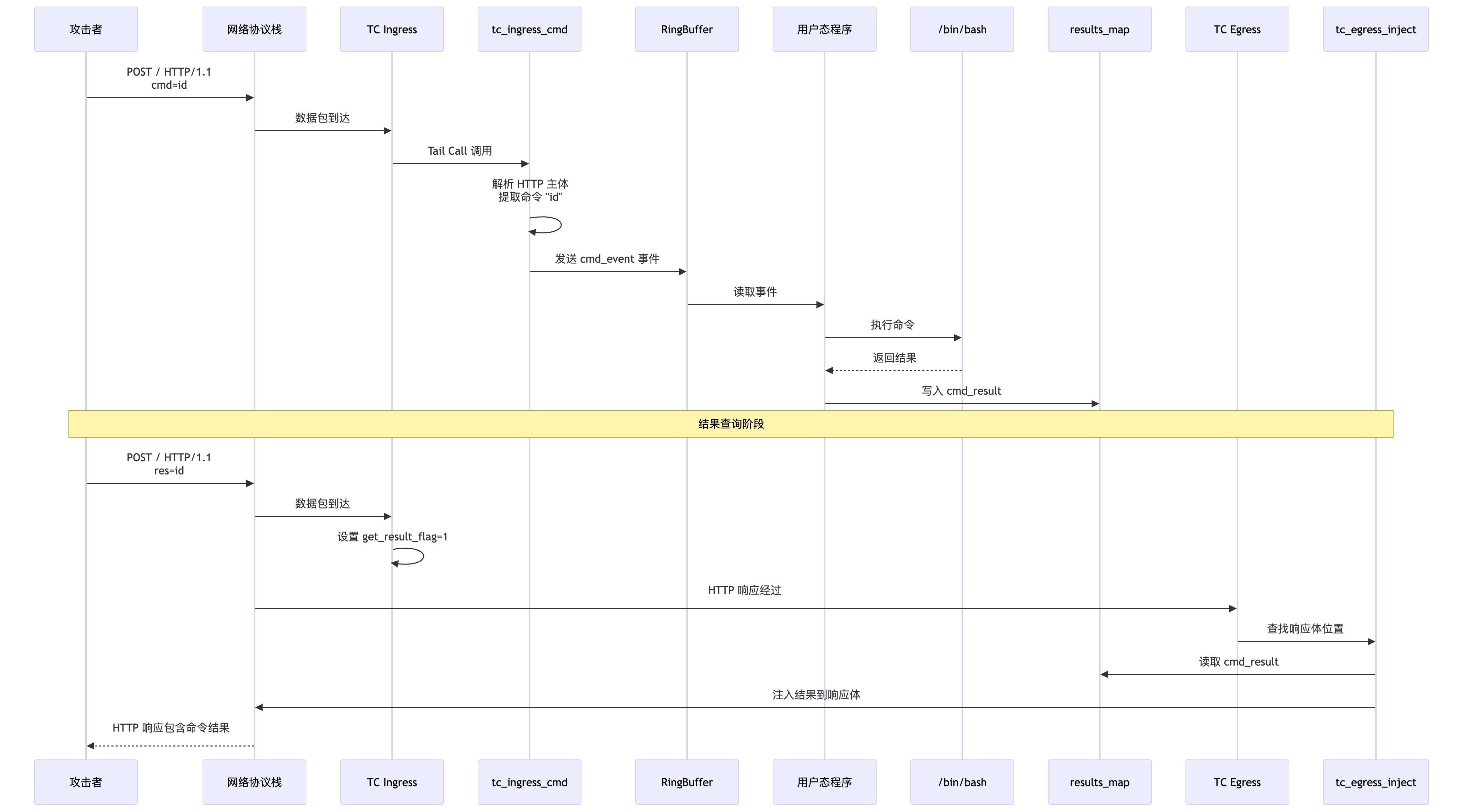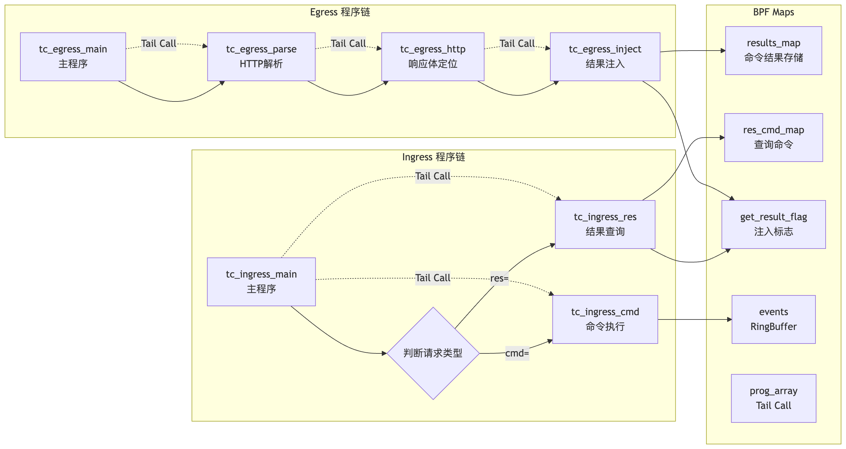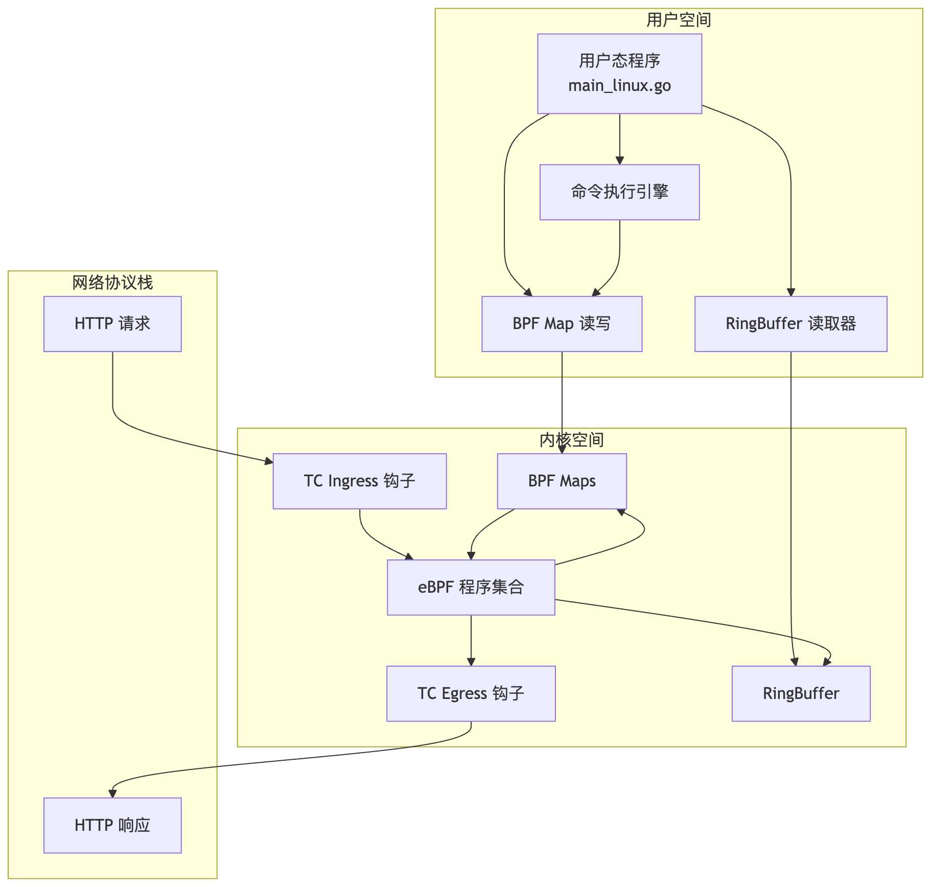 - 用户态程序:负责执行命令,并通过BPF Map与内核态程序通信